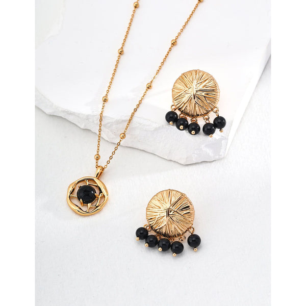 A Statement of Everlasting Sophistication: With a perfect balance of antique allure and modern refinement, these earrings elevate any ensemble, from casual outfits to evening wear. The golden finish, paired with the profound luster of black agate, develops a harmonious blend that enhances your natural glow and includes an atmosphere of exclusivity to your flair.