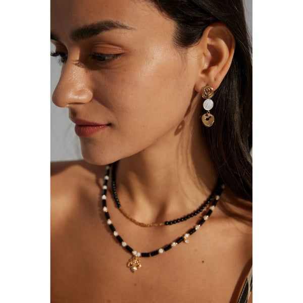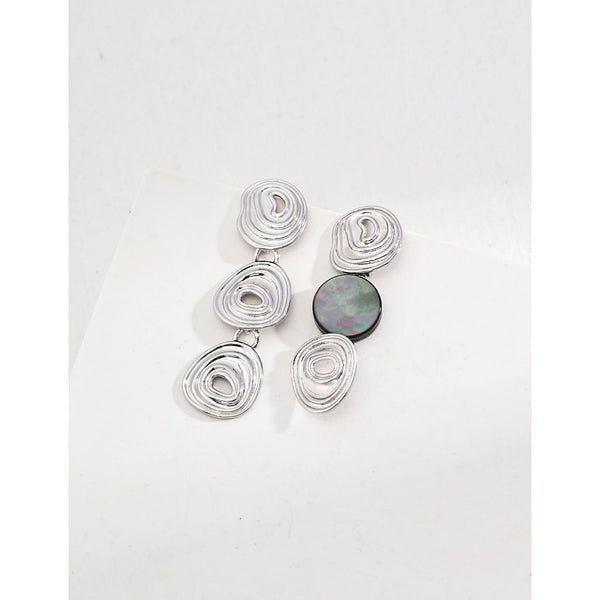 Precisely crafted, the earrings feature hypoallergenic sterling silver intricately twisted into a modern yet vintage-inspired winding silhouette. An alluring organic black shell center dazzles with iridescent hues, evoking the magnificence of the ocean's enigmatic depths. Measuring around 4 cm in height and 1.3 cm in width, the earrings balance boldness with discreet polish, ensuring they generate attention without swamping your style.